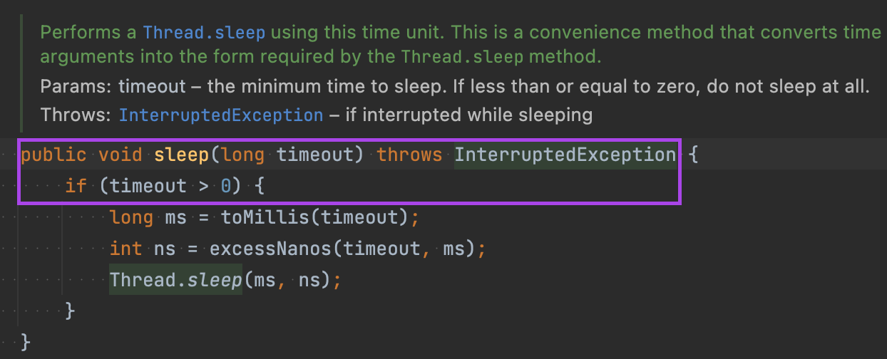 ์ฝ๋๋ฅผ ๋ณด๋ฉด ๊ฒฐ๊ตญ TimeUnit.Sleep์์ Thread.sleep๋ฅผ ์ฝํ๋ค.