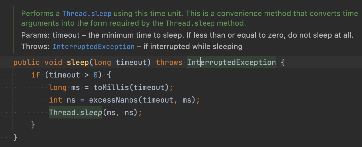์ฝ๋๋ฅผ ๋ณด๋ฉด ๊ฒฐ๊ตญ TimeUnit.Sleep์์ Thread.sleep๋ฅผ ์ฝํ๋ค.